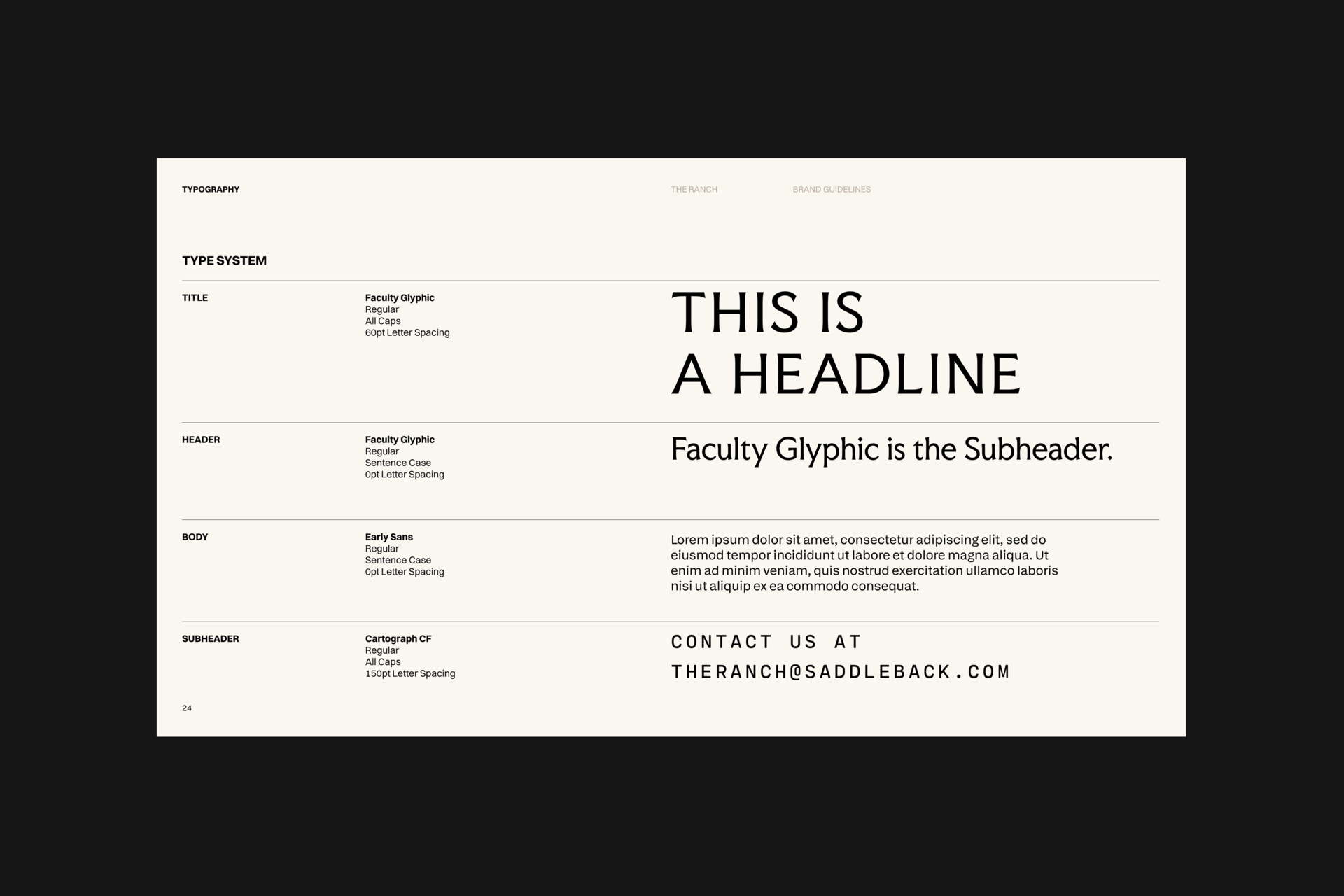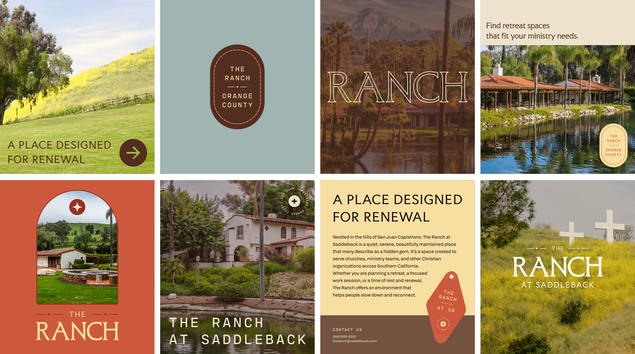 My intention behind this brand was to create a robust identity that encouraged versatility in application, which is why there is a variety in brand marks, an elaborate coloring system, and timely typography. This visual approach echoes the Ranch’s roots in San Juan Capistrano’s culture while remaining flexible to growth as it embarks on new endeavors as a retreat center.